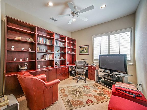 This beautiful home has many upgrades throughout: kitchen has extended counter, stainless steel appliances, tile flooring is laid diagonally, custom backsplash & hood, built-in wine fridge and trash compactor. Ceiling fans & planation shutters throughout, new water heater, & a potassium water softner. Wall to wall custom cabinetry and shelving in office, a gas fireplace and dual a/c. An inviting backyard with with large covered patio, jacuzzi, mature landscaping, nice landscaped side yard and large stainless steel bbq that stays. Front yard has welcoming landscaped courtyard and an upgraded tile walkway and fountain. A very nice home that has been very well cared for.
