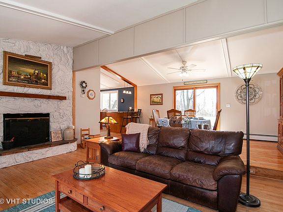 Imagine country living on over half an acre parcel in unincorporated Cary. This 4+ bedroom ranch home says welcome home with a covered entryway & new driveway. Bring all the toys, there's plenty of room in detached 2.5 car garage, full basement w/ additional storage/office/craft/possible 5th bedroom. Cook for a crowd in a well-equipped kitchen w/ NEW stove, breakfast bar, island & skylight. Unwind & indulge in your master suite w/ double decker walk-in closet & second SGD to deck. Dining room provides access to the entertainment sized deck and backyard with swing, hammock, wildlife, mature landscape & trees. Spacious master bath features whirlpool tub & walk-in shower, pantry, double sinks and skylight. Enjoy cozy nights in the living room by the wood burning stone fireplace. Upgrades include: Freshly painted, vinyl windows, hardwood floors, NEW overhead garage door 2019, NEW energy hydronic heat boiler 2018. No outlet street, no HOA fees! Cary park district/library, golf, bike, Metra