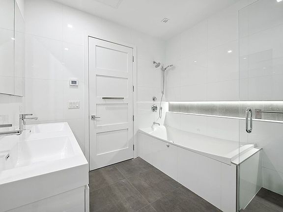 Through a large wardrobe closet to your master bathroom trimmed with Porcelain, radiant heated floors, ECORESPONSIBLE inspiring and well-thought-out product from Produits Neptune 70-inch air bathtub, German made Hansgrohe Metris faucets, Rain Shower head and cut in-to-frame shelving with accent LED track lighting make you feel like you’re in the spa!