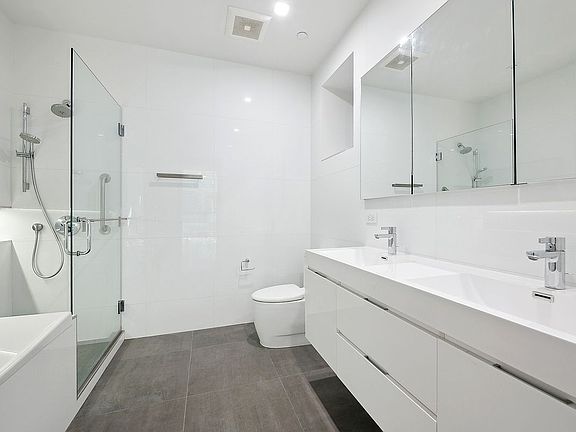 To the left second bathroom has a large stand-up shower with rain shower head, a Neptune Zen Floor toilet w/dual flush system, Fresca Santo Medicine cabinets with mirrors and LED lighting systems, and Hansgrohe Metris faucet. Heated floors topped with gorgeous Porcelain Raw grey matte tiles.