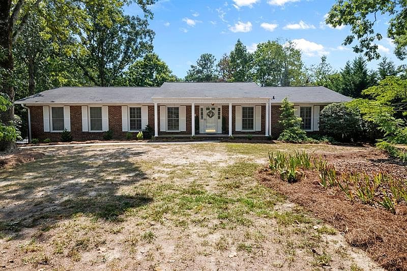 Charming 3 bedroom, 2.5 bath brick ranch home sits on a private 2 ACRE lot! This meticulously maintained home features a rocking chair front porch, and large den with a brick fireplace adjacent to a lovely screened-in back porch overlooking the pool area. Beautifully updated kitchen with granite countertops, and stainless steel appliances with double ovens. Large master bath with double vanity and granite countertops on the main, and 2 additional bedrooms share a full bath. Carport could easily be converted to a 4th bedroom or bonus room. Outbuilding included.