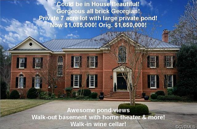 Now $1,085,000! Orig. offered at $1,650,000!! This gorgeous all brick Georgian mansion style home is nestled on 7 private acres that include a private stocked pond! Truly beautiful and detailed millwork. Generous room proportions throughout! Lots of charm and character! This house is the epitome of understated Richmond elegance while being family friendly and wonderful for entertaining. Tucked in a small quiet hidden gem of a neighborhood off of the Manakin Road corridor, it is convenient to Hermitage Country Club and is just minutes to Short Pump. 8490+ sq. ft. including a partially finished basement with family room with home theater, walk-in wine cellar, dedicated exercise room, full bath and room for your favorite billiards table. Stunning gracious foyer, 2 story great room, large screened porch, private 1st floor guest bedroom suite are just some of the wonderful surprises you will find. Lots of walk-in storage as well. Well maintained and in move-in condition! Some very minor cosmetics may be preferred & seller has priced it, keeping that in mind! This house is truly a steal! Priced under assessment! Better hurry to see it!