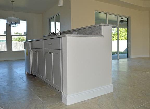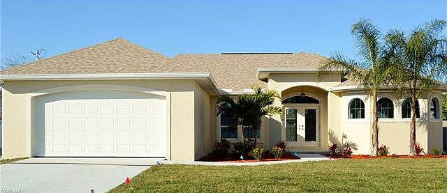 Rare SE Cape- New Construction 2017. Great location off Santa Barbara, close to everything. All Cape Coral city utilities are in and paid. No flood insurance required. 3 Bedroom 2 bath Great Room home with 1,771 square feet of living area. Many upgrades. 9 ft. 4 inch ceilings with 10 ft. 4 inch trays. 20 inch Porcelain tile throughout, custom wood cabinets with granite tops. All windows and sliding glass doors are PGT Low E insulated. Ceiling fans throughout. Master Bath w/ dual vanities and sinks, and spacious walk-in shower. 6/12 roof with insulated decking. Automatic sprinkler system, huge under truss lanai. Driveway, upgraded Floritam sod and landscape package included. Ventilated attic provides added storage space. Much more. Must see.