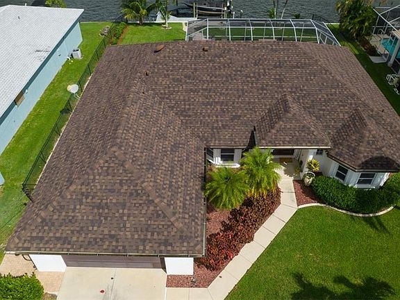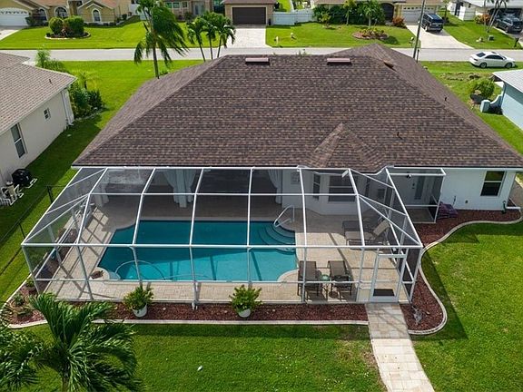 NO FLOOD INSURANCE REQUIRED. NEVER FLOODED. PRICE jUST REDUCED. Experience the ultimate Southwest Florida lifestyle in this beautifully upgraded and immaculate Gulf-access pool home. Just one bridge (9’6” clearance) to open water, this tropical retreat is perfect for boating enthusiasts and those who love to entertain. Enjoy sunny days by your screened-in, heated saltwater pool, with oversized covered lanai, surrounded by lush landscaping and a private fenced yard. The covered dock features a captain’s walk, durable synthetic decking, and a remote-controlled 10,000 lb lift—ready for your boat and endless days on the Gulf. Inside, you’ll find an open, light-filled layout with plantation shutters, crown molding, and designer finishes throughout. The chef’s kitchen is a showpiece with quartz countertops, tile backsplash, under- and over-cabinet lighting, and a large island/breakfast bar, ideal for gatherings. A Bluetooth sound system flows through the great room and lanai, —perfect for relaxing or hosting friends. The primary suite offers pool access, tray ceilings, and a spa-like bath with walk-in custom closets, ample cabinetry in separate vanities, a barrier-free walk-in shower, and a soaking tub and separate bluetooth sound system. Step outside to the expansive lanai with a wood ceiling, white curtains, and custom lighting, creating a serene outdoor living space. Recent updates include a 2023 roof, 2022 A/C system, and 2021 water heater with a hot water circulating system. A deep garage with custom cabinetry and a concealed paved side area complete the package. Move-in ready and minutes to the river—this home combines luxury, comfort, and true Florida waterfront living.