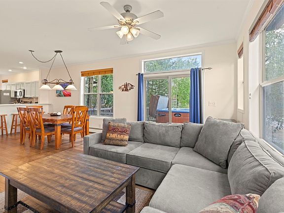 Nestled in the Wildernest area of Silverthorne, this recently updated 3 bedroom, 3 bath, 1968 sf townhome boasts an exceptional location with easy access to four world-class resorts and numerous trails winding through the nearby Eagles Nest Wilderness Area including Lily Pad Lakes, Buffalo Mountain, Salt Lick and more. The townhome features a well-maintained interior, views of Lake Dillon from the upper level, abundant natural light, and high ceilings on the main floor. It has a separate one-car garage with room for gear storage. There are two main living areas: one on the main level and one on the lower level. The main level features an open floor plan with a fully stocked kitchen perfect for preparing delicious meals. The outside deck with hot tub and gas BBQ grill provides the ideal setting for outdoor entertaining. The upper level features two primary suites with updated modern bathrooms. Downstairs, the lower level has a bunk room, full bathroom, and large living room with sectional sofa and TV. It can be used as an office, guest suite, or hangout spot for teens. With its prime location, this townhome is an ideal place to call home in Silverthorne, offering an authentic Colorado mountain lifestyle.
