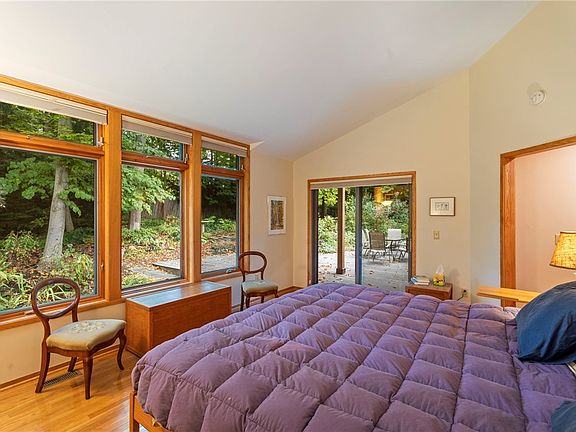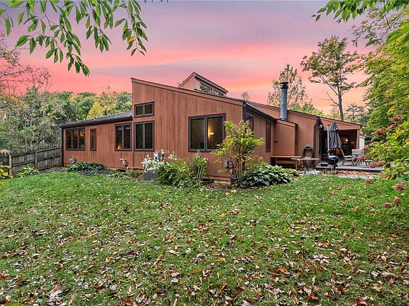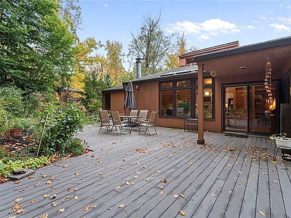 With mid-century sophistication, this spacious contemporary home has loads of charm in a private setting in the middle of the desirable Northeast neighborhood. Five large bedrooms all on one level plus three full baths. Windows on all sides view gardens of every type of plant, full-sun and shade, even water lilies on the pond. Open kitchen with granite counters and induction cooktop on the island flows into great room with dining and living space through glass sliding doors onto a deck in the intimate backyard woods. Formal entryway, with sunken living room ready for elegant soiree or a cozy book talk. Hardwood floors throughout. Loft space for quiet reading or video games. Grand primary room with walkthrough closet and ensuite two room bath. Solar panels ease the utility costs, and central a/c keeps summer comfortable. Full-height basement for play. Attached two car garage with tons of storage, mudroom and laundry. Truly the best of suburban living around the corner from Northeast elementary/DeWitt Middle School, just a few minutes from Cornell University, Triphammer Marketplace, Downtown Ithaca, the airport and business parks. Any Offers to be reviewed Tuesday 10/29.