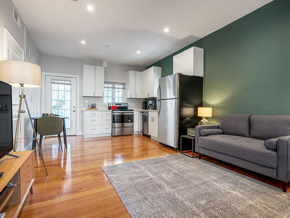 Spacious and contemporary studio and one bath located in Jeffries Point. This polished unit boasts oak stained hardwood floors and a high end kitchen with quartz counter-tops, recessed led lighting and elegant modern shaker cabinets. The bright and open floor plan that opens up to your private deck is perfect for entertaining. In-unit washer/dryer, central heat/AC, and just a 5 minute walk to Maverick T stop. Water included in rent. Option to rent furnished or unfurnished. Pets negotiable.