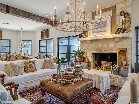This beautiful 61+/- acre ranch is located just 5 minutes from Boerne! As soon as you drive in through the gates you are greeted with grand Oak Trees leading up the paved driveway to the gorgeous home. The home is a 3 bed/3 bath, along with a detached 3 car garage with a guest apartment above! The home sits above Balcones Creek, which stretches along the southern side of this meticulously maintained property! Besides the wet weather creek, there are also multiple ponds that fill off of rain water, beautiful fields, and majestic oak patches throughout the property! The stunning home was carefully thought out, down to every unique detail. The luxurious master suite features high ceilings, lots of natural light, and a 2-way fire place that opens up into the spacious bathroom and closet. Two additional bedrooms each have their own private bathroom as well. The living room and kitchen create an ideal open concept with high ceilings, rock walls, and a rock fireplace. The Chef's kitchen is beautiful with top-of-the-line appliances, oversized center island, large pantry and a breakfast nook. There is also a second story covered patio that looks over Balcones Creek. Step into the grand courtyard and head over to the 3-car garage or the private guest apartment that sits above the garage. This apartment has an inside sitting area, private bath, and large covered patio highlighted by the fireplace and long-range views! The highlights don't end there, this property also features a 4,500 SF barn with 220-amp, water and electric, and fiber optic. The perfect spot for storge or to finish out into a game room, horse barn, or more! This one-of-a-kind property is a must see with properties of this size and privacy coming up for sale very rarely this close to Boerne!