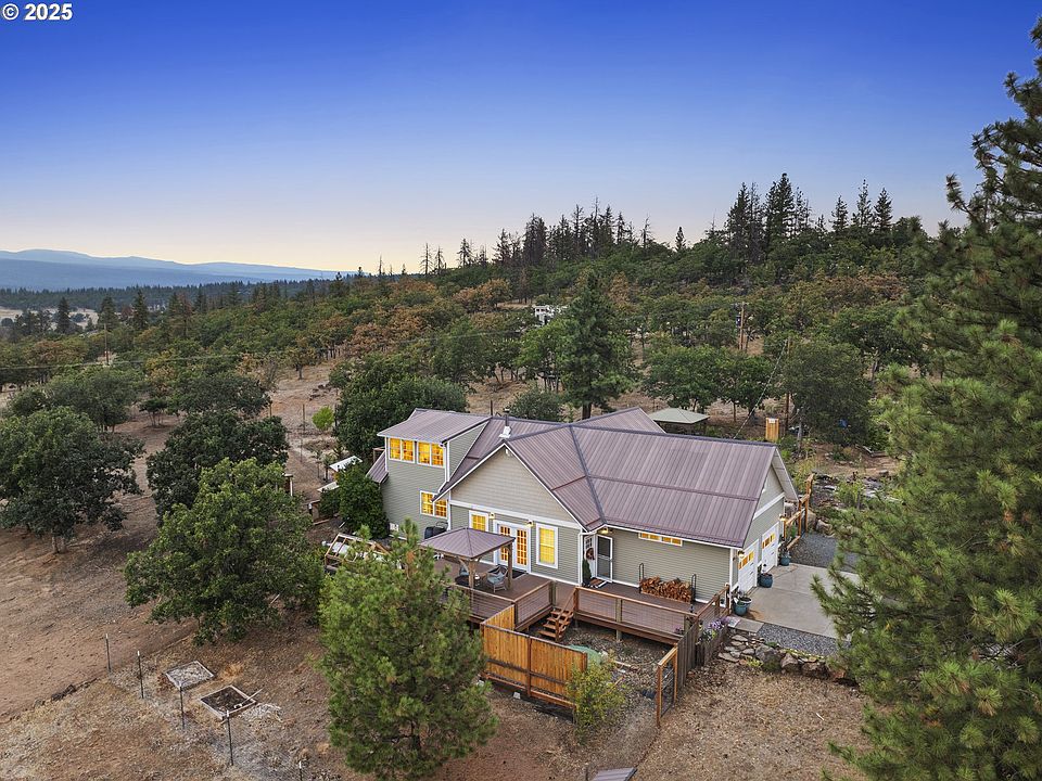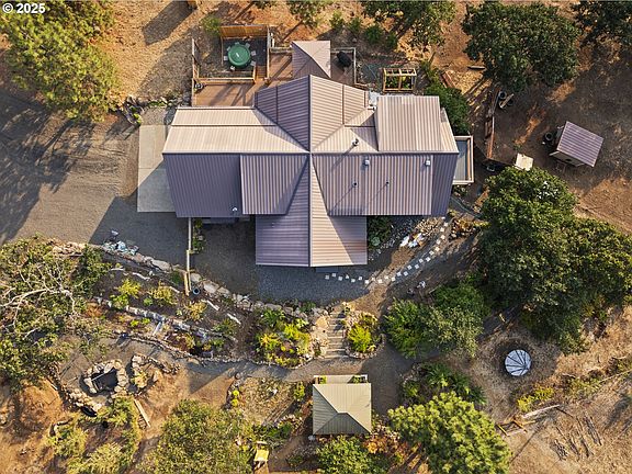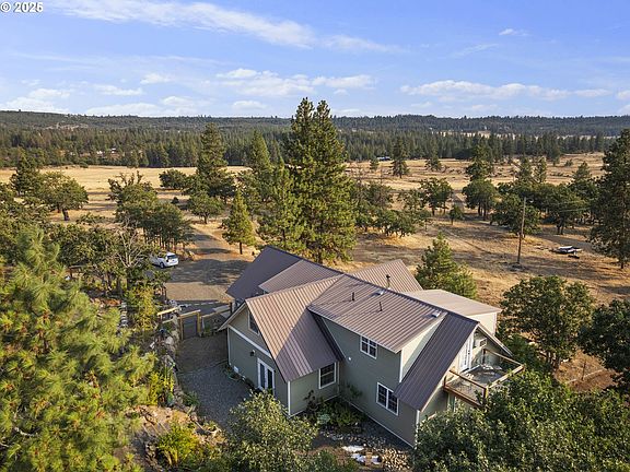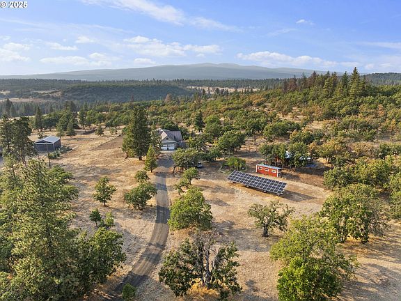 A beloved retreat and thriving Airbnb with countless five star reviews and loyal returning guests, 309 Woodland Rd has been a place of comfort, gathering, and inspiration. From the moment you step inside, lofty ceilings and exposed beams create a sense of openness while natural elements and thoughtful finishes bring warmth and style. A stone hearth anchors the great room and brickwork in the main entry offers a timeless welcome. The home blends character with modern updates. Brand new quartz counters brighten the kitchen. Heated tile floors in the main upstairs primary bath and downstairs bath add comfort. A hybrid water heater and a fully owned solar system with nearly 30 kWh of backup batteries keep utility costs near the KPUD base fee. The spacious double car garage offers ample storage and serves as the hub for the solar setup. A Level 2 EV charger and whole house filtration and softener system add convenience. The deep aquifer well, producing 50 gallons per minute when drilled, combines with solar to create a truly sustainable, off-grid capable homestead. Almost 12 acres provide endless opportunities for recreation, with open fields in the front and a private oak and pine forest in the back. Abundant wildlife! Deer, turkeys, and even famous local bluebirds call this land home. Outdoor living shines with over 15 fruit trees, raspberry beds, a semicircular vegetable garden, deer fencing, and a natural boulder-framed water feature. Two high-ceiling sheds with water and power enjoy sweeping views of Mt Hood. Pavilions provide space for barbecues, fire tables, or quiet garden moments. For those seeking a homestead lifestyle, the property includes an extensive goat pen along with free range space for chickens and ducks. For those dreaming of hospitality or gatherings, the established Airbnb success and multiple outdoor venues create incredible potential for weddings or events. This is more than a home, it is a lifestyle retreat designed for sustainability!