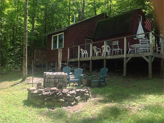 Rustic, furnished cabin with 9.7 acres, less than 5 miles from the groomed snowmobile trail system and bordering state lands that include an eighty-five acre pond. This two bedroom cabin will comfortably sleep six. Spend your days hiking, fishing or hunting and spend your nights around the fire pit or star gazing on the large deck.The adjoining piece of land consists of 6.61 acres of beautiful woods and can be purchased with the cabin or by itself. Both of these pieces have power available at the road.Cabin with 16.31 acres (both pieces) is $49,900