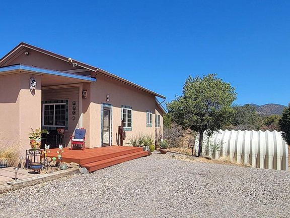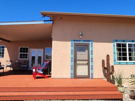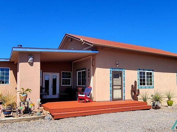 Retreat home with Stunning Views: This light-filled, custom 2-BD, 2-BA home is full of color and character, offering a unique blend of warmth and style. The home features an office and a bonus room, with each wing a master suite. High ceilings, expansive windows, and tile floors enhance the hacienda-style ambiance, while a spacious covered porch provides the perfect space for outdoor living. Set on 2 acres of usable land carved from a picturesque ranch, the property offers breathtaking long-range and mountain views. The landscape is both beautiful and functional, creating a sense of seclusion while still being conveniently close to town and shopping. A sturdy metal Quonset-hut garage/workshop with electricity and water adds practicality, along with a private well and five additional outbuildings—one serving as a chicken coop and the others used for storage and food-storage space. A one-car carport, a side-by-side vehicle, a generator, and a trailer are also included. For recreation, the property is located near a frisbee golf course, making it ideal for enthusiasts. There is a great building site on the property for new construction. This home perfectly balances the tranquility of country living with modern conveniences—schedule a showing today and experience its charm firsthand!