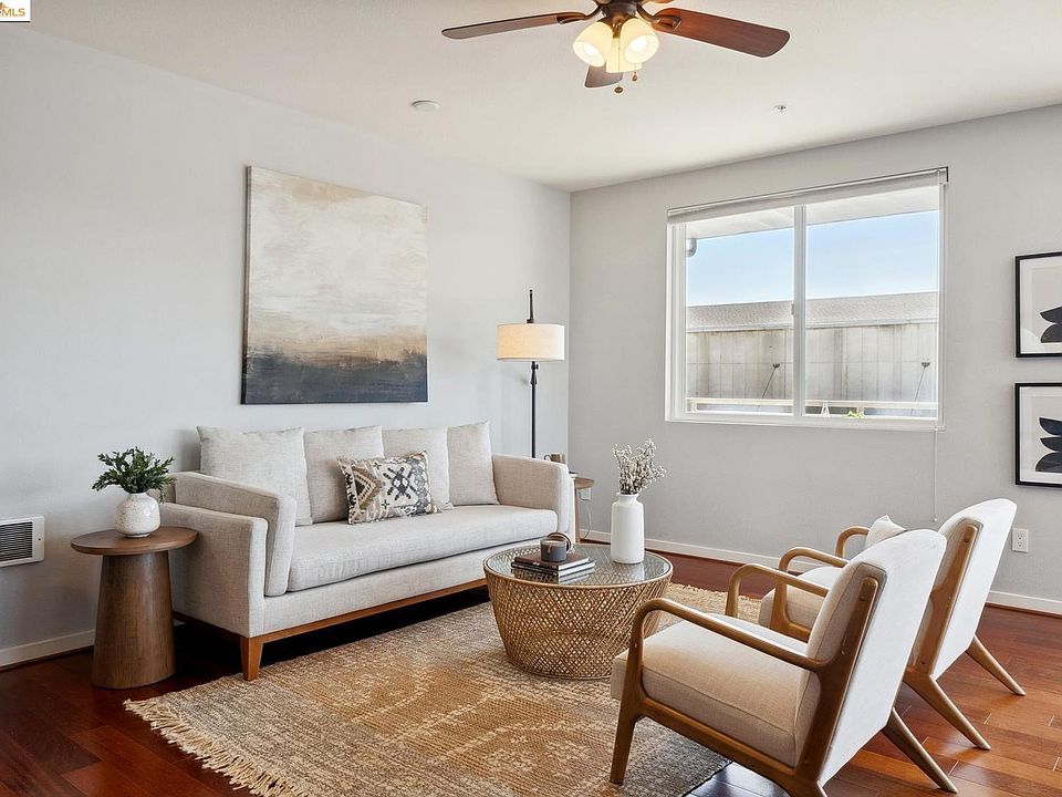 This rare second floor corner unit offers an impressive wraparound balcony with two spacious hangout areas, perfect for outdoor dining or relaxing. Inside, you'll find an open-concept layout combining the living, dining, and kitchen areas, ideal for hosting. The kitchen features stainless steel appliances, plentiful cabinetry, and a large pantry. Floor-to-ceiling windows flood the living space with natural light. With two full, generously-sized bathrooms and a walk-in closet in the primary suite, this home combines comfort with functionality. Smart thermostats ensure efficient climate control, while in-unit laundry adds convenience. Two parking spaces, including EV charging, are a rare find in this location. Residents enjoy access to an on-site gym and the nearby tidal canal, where you can launch a kayak or watch rowers from the California Rowing Club. Close to Alameda’s vibrant shops and restaurants, with easy access via the Park Street or Miller Sweeney Bridge, this home blends modern convenience with serene outdoor living. The building itself is impeccably maintained, with lush landscaping and vibrant greenery that add to the overall sense of tranquility and care.