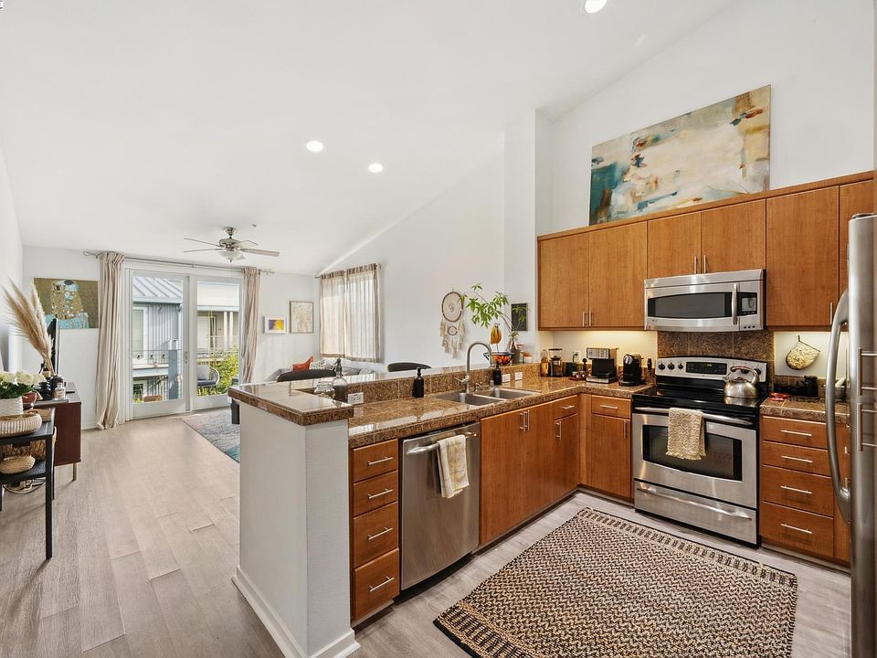 Discover the perfect blend of space, style, and convenience in this rare fourth-floor end unit! This spacious 2-bed, 2-bath home features vaulted ceilings that create an airy and inviting ambiance. Abundant natural light floods the space, enhancing the open-concept layout. The modern kitchen is equipped with stainless steel appliances, while the in-unit washer and dryer add everyday convenience. Nestled in a prime location, this home offers easy access to BART, major freeways, and is just minutes from the waterfront, making commuting and recreation effortless. This Short Sale presents an incredible opportunity to own a home below market value—ideal for investors or buyers looking to build equity. Don’t miss out on this unique chance to own a top-floor sanctuary in a desirable location!