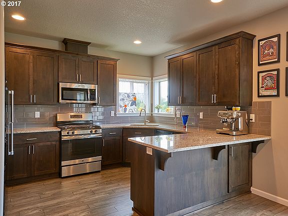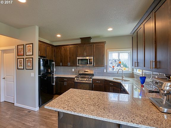 Convenient Location, friendly neighbors & beautiful panoramic view of hazelnut orchard & green space. Good morning light w/evening sunset views over the coastal Mt. Sprinkler system & cottage garden w/room to expand outdoor living space. Soft grey colors, subway tile, pantry, SS appliances, spacious laundry room, Great room concept, gas fireplace,large bonus room, 4 large bedrooms, including master suite. Pristine condition.