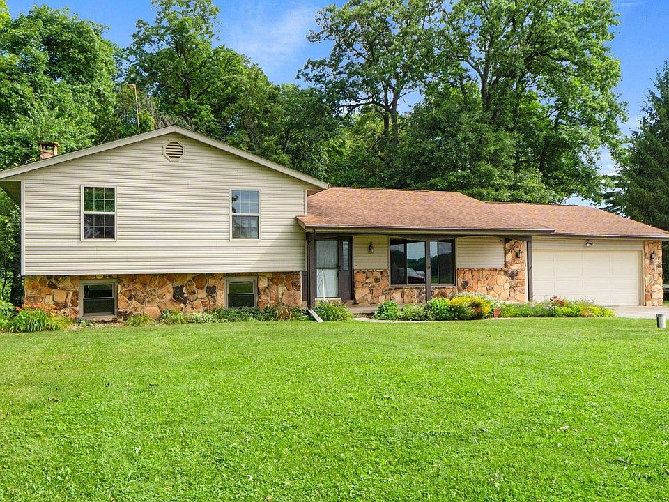 This tri-level home with attached two car garage on a finished basement sits on a country lot. It offers three distinctive living areas as well as personal space for family. As you enter the home, you will find the living room which leads to the kitchen, dining area and half bath. The lower level features a brick fireplace, possible home office space, full bath, laundry room and outside access. The lower level also leads to a fourth level, full-finished basement with built-in bar and extra room for social entertainment, as well as extra storage closets. On the upper level, you will find a primary bedroom with two closets and sliding patio doors leading to a deck overlooking the wooded back yard that offers privacy, beautiful views, and a sense of tranquility. The upper-level features two additional large bedrooms and a full bath, as well as further storage in the hallway.