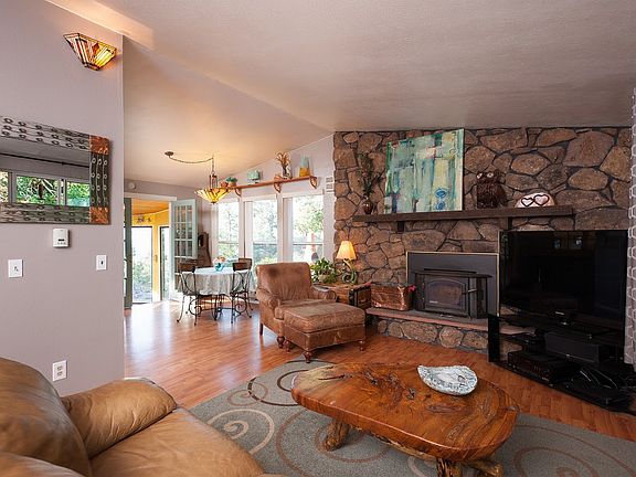 Mountain serenity 20 minutes from C-470. Surrounded by Mother Nature's gifts, this beautiful 3 bedroom, 2 bath, ranch-style living on a quiet cul-de-sac is sure to entice. The generous living room with it's dramatic stone, wood burning fireplace is a perfect setting for any cool or snowy Colorado evening. The tasteful kitchen and dining space flow into the four-season room with floor to ceiling glass and priceless views. The spacious primary bedroom lit with skylights, has sliding doors out to one of the many decks and has a full bath and walk-in closet. Make the adjoining bedroom an amazing office, kids bedroom or exercise room. Main floor is completed with another bedroom and a full bath with its own very special skylight. Several decks provide tons of entertainment space outlined with rock croppings, pine trees and wildlife. Climb into the treehouse for some bird watching or camp out. The deck offers a 220 plug for your hot tub. This terrific lot boasts 1.18 acres. The 8 x 10 storage shed will hold all your miscellaneous and there's room off the road for 3 vehicles. Water heater new in 2019 and water meter sewage ejection pump new in 2019. If ever a mountain home was your dream, look no further. Please come make it your own.