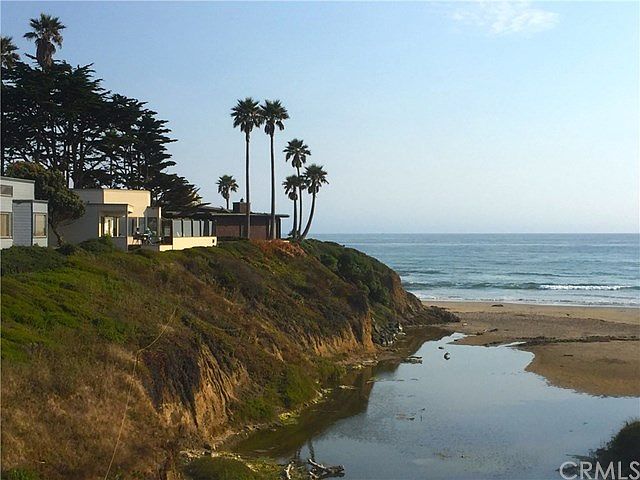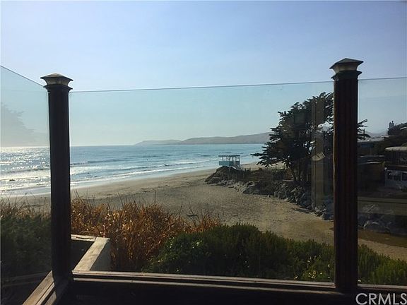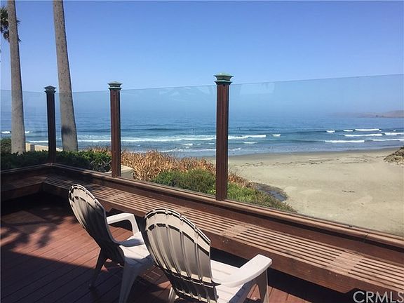 Single level Cayucos beach home sits directly above the sand where Old Creek meets the sea. It is an ocean front gem. Watch the sunset, the surfers, whales and otters from your deck, living, dining room or kitchen. The deck has a glass windbreak for breezy days. The living room has a large stone fireplace, wet bar, window seat and a clerestory window balancing out the sunlight. This home has two bedrooms, two bathrooms, two car garage and a large side yard with a beautiful garden that's fenced for pets.. The kitchen has granite counters, stainless steel appliances and a sink that looks directly out toward the sand and sea. Meals will be a pleasure in this home, dine inside or out on the deck, either location provides an amazing ocean view. A large laundry room provides additional storage, and there's a workbench in the 2 car garage. This is an interesting ocean front location that looks out toward the north and west. Your ability to enjoy the California Coast is never disturbed with these pristine coastal views.