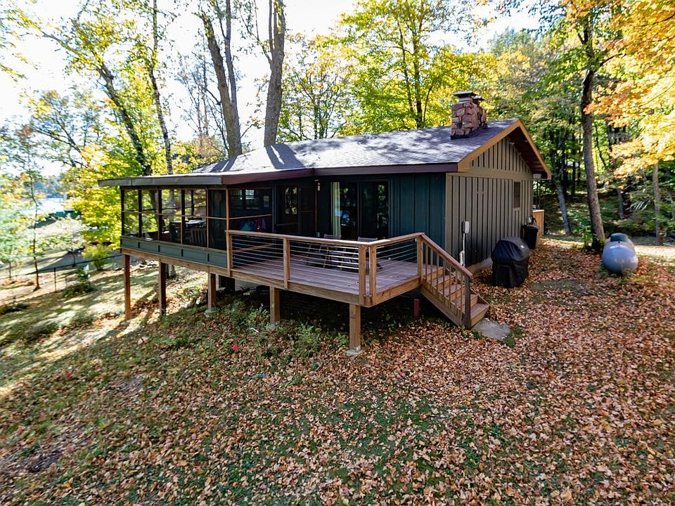 1250 acres of water on Chain Lake, McCann, Island and Clear Lake. You have 95 feet of very private lake frontage with tremendous views up and down the lake. The interior has been updated in the last couple years and is ran as a very successful AIRBNB. Enjoy this year round get-away as it includes a stone fireplace, a screened porch, an open deck and full walk out basement. It has two bedrooms and an open floor concept. This one is on the right lake, in the right location, and at the right time. Nice! Private! Manageable!