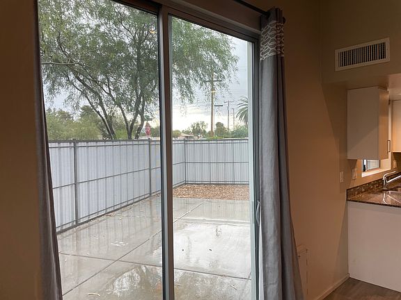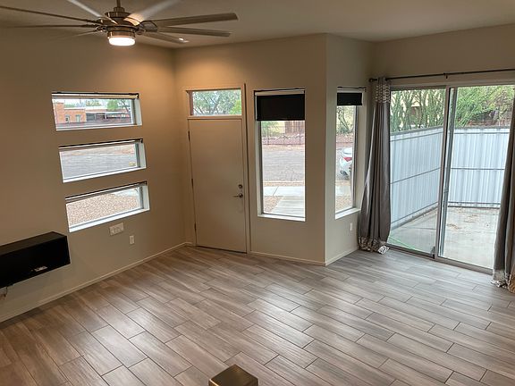Contemporary Architecture inside and out! Open living area includes spacious greatroom with strategically placed windows, opening into a modern kitchen with stainless steel appliances, island and loads of cabinet space. There is even a powder room on the ground floor! Garage enters right into the kitchen making it a breeze to bring in the groceries! Sliding glass door opens up into your private patio ''yard'' area with uncovered patio and landscape rocks. Add a few pots and furniture for an amazing private outdoor living space. Two bedrooms both with their own ensuite bathroom, linen closet and full size stackable washer and dryer round out Upstairs. Wood look tile floors everywhere but bedrooms. This home is in close proximity to U of A, Banner, and Downtown