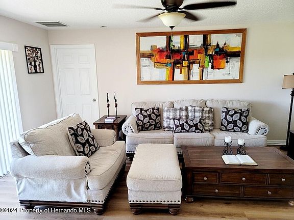 MUST SEE updated 3/2/2 home, situated on hole 5 in the Sherman Hills Golf and Country Club, Immaculate home features low maintenance landscaping with spunkier system. Home has ProCore Luxury wood vinyl flooring in the spacious living area the opens up to the beautiful kitchen with granite counter-tops, center island w/breakfast bar, 3 1/2 years old Whirlpool stainless steel appliances and area for dining table. Large master bedroom en suite is spacious & features beautiful quartz top dual vanity with tile back splash and huge walk-in closet. Bedrooms 2 and 3 are also good sized and share a common bathroom with granite top vanity & tub/shower combo. AC was replaced in May 2021. Watch the sunset from your back porch overlooking the beautiful maintained golf course, or enjoy one of the amenities offered to you by the community. Sherman Hills Golf & Country Club is located just a 1/2 mile east of I-75 in eastern Hernando County providing easy access to Tampa, Orlando, & Ocala.