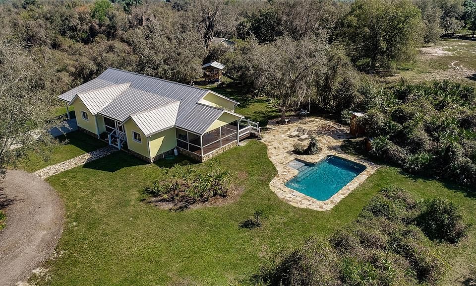 This is country living at it's best! This 4 bedroom, 2 and half bath pool home sits on over 2 and a half fenced acres zoned Agricultural/Low Density Residential. Great family home with almost 1,800 square feet of living space offers soaring vaulted ceilings and plant shelves, decorator light and fan fixtures, color accent walls, and rich wood flooring. Keep warm on those cool evenings in the Great Room sitting by the gas fireplace with stone façade and built in shelving. Kitchen boasts pantry, warm wood cabinetry, built in wall oven, and tiled counters with breakfast bar that opens to the dining area and Great Room for easy entertaining. Master suite has walk in closet and private en suite bath with his and hers sinks, soaking tub, and separate Roman shower. Dedicated laundry room has an additional adjacent wall pantry for extra storage. Other features include updated bath fixtures, metal roof, 1488 square foot pole barn with storage and office, attached 2 car carport, open flagstone patio with fire pit, screened front porch, and screened back porch with newer wood plank composite decking overlooking the pool and acreage. Your saltwater pool is surrounded by flagstone pavers and overlooks the beautiful, serene acreage. Welcoming curb appeal with circular drive and screened front porch. Proximity to waterways, local beaches, dining, shopping, and golf courses makes this property ideal for the Florida lifestyle. Also, easy access to public parks with bike and walking trails and picnic areas, and boat ramps providing access to many waterways, beautiful Charlotte Harbor, the Peace and Myakka Rivers, and the Gulf of Mexico. And quick access to Interstate 75. This home offers true Florida rural living.