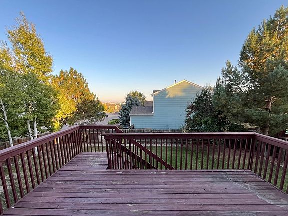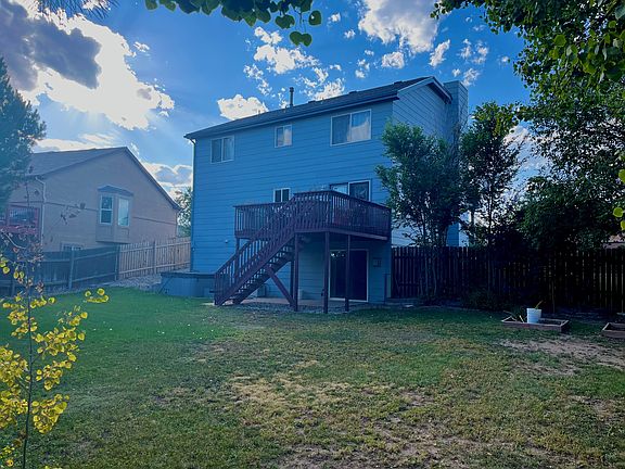 Lovely 4-bed, 4-bath home in quiet neighborhood, new Central A/C, 3 fireplaces for those chilly days and ambiance, walkout basement. Large corner lot with a front porch, 2-car garage with extra room and storage, plenty of house storage, plenty of parking, fully-fenced backyard with 2 raised flower beds, large main-level deck, trees for privacy. Over-sized master bedroom with partial Mountain View has an attached office suite with a fireplace and a 5-piece master bath. 3 beds and 2 baths upstairs, 1 bed and bath in the basement. Ideal location for Peterson and Schriever SFB, and also great for Fort Carson and the AFA. Very close to restaurants and shopping. Walking distance from Remington Elementary, Sand Creek High School, and a beautiful neighborhood park.