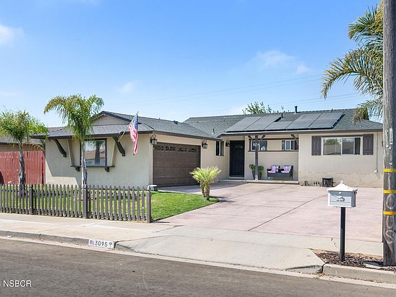 Beautiful one story home featuring 3 bedrooms, 2 full baths, central heating, and a two-car attached garage. There are many upgrades to the house and property. The interior has recently been painted throughout, with laminate flooring, a spacious living room with a beautiful fireplace, upgraded kitchen cabinets, granite countertops, gas stove, and stainless steel refrigerator included. An indoor laundry room comes with washer and dryer included. Both bathrooms have been upgraded. The exterior features a newer roof (approximately six months old), newer garage door, and a beautifully landscaped front yard with green grass, palm trees, and a brown picket fence. The backyard is spacious with green grass, palm trees, a covered patio, and a dog run. The wood fencing is newer with an extended wood lattice for added privacy. The driveway is beautifully finished with stamped concrete, and the property also offers RV parking. This home has a 220 electrical system and a Tesla outlet for electric vehicles. Located in the desirable area of Orcutt, close to schools, parks, shopping, and with easy highway access. This is a must see!