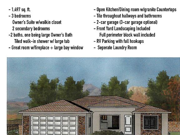 Gemstone Custom Homes - Construction to be complete 12/8/25. No HOA! This home features drought-tolerant professionally landscaped front and backyard with a covered patio. Master suite includes spacious walk-in closet and fully-tiled recessed walk-in shower with glass door. Two car garage is fully drywalled and painted! Quality GE appliances, Moen Plumbing fixtures, quartz countertops, spacious pantry, and classic stained hardwood cabinetry with soft-close hinges and under-cabinet lights. Woodgrain tile floors and gas fireplace in living room. Thirty-foot paved RV pad with full-hookups (sewer dump, 30-amp outlet, water connection) - Total width of the side yard with RV pad is approximately 25'! (water, 30-amp + sewer dump).
