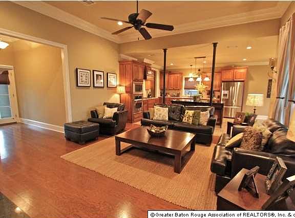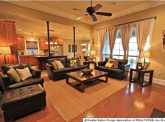 ON THE LAKE and only minutes from the interstate! You will love this open floorplan laid out perfectly for enjoying the beautiful view of the lake from all the main living areas & the master bedroom! Sellers completely fenced yard with true Wrought Iron Fence and added New Orleans style, custom, Wrought Iron columns separating living room and kitchen. 4 Bedroom plan split into 3 separate bedroom wings & OFFICE with built-in desk and cabinets. Kitchen & Dining amenities include: travertine subway tile back splash; HUGE slab granite island with oversized counter for barstools; stained, raised & staggered cabinets; cabinet pull out hidden trash compartment; large pot drawers; stainless appliances; walk-in pantry; 18 ceramic tile floors. Living has: wood floors; gas log fireplace with granite tile enclosure and ornate wood mantle; triple crown molding & 11 ft ceiling. Large, Walk-In Utility room has hanging rod, shelf & cabinetry. Rarely do you find a home too with ALL bedrooms having walk-in closets! Bedrooms 3 & 4 share a Jack & Jill bathroom with 2 private sink areas with ceramic tile counters. BR 3 is used as play area and has built-in cabinets/shelves to remain PLUS fun chalkboard/magnetic wall! Master wing has a small private foyer at entrance. Master bath has his/her walk-in closets, his/her separate sink areas, walk-in shower and jetted tub with tile enclosure. Home is under termite contract, wired for alarm & has extended patio in back.