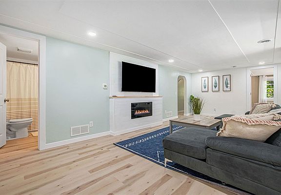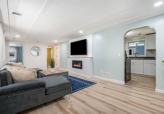 Bright living room with new furniture, 65" flat-screen TV, and LED fireplace