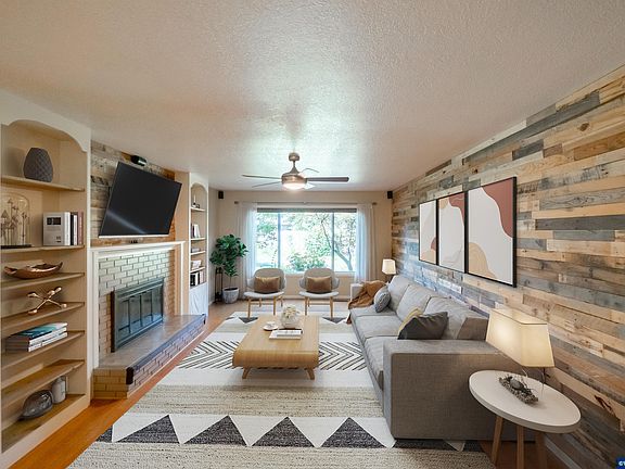 Located on a quiet cul-de-sac in a serene neighborhood. EV Charger. Beautiful large, lush yard w/ covered outdoor living space. Dramatic rock archway flows to generous open kitchen & dining space; enjoy the sunroom w/ beautiful barn door providing flexibility & quiet. Living room w/cozy fireplace & built-in bookcases looks out to backyard oasis. 3 bedrooms, 2 full baths & large laundry room. Primary bedroom boasts ample storage, adjacent bath Bamboo floor, AC newer windows furnace & roof!! UG sprinklers.