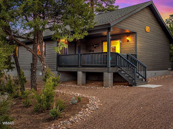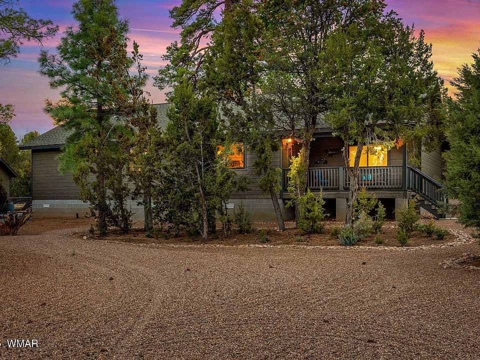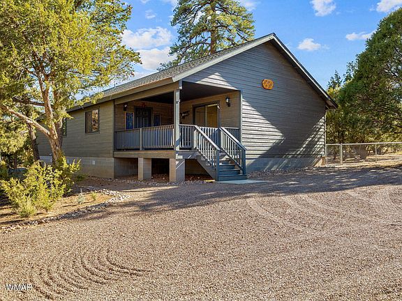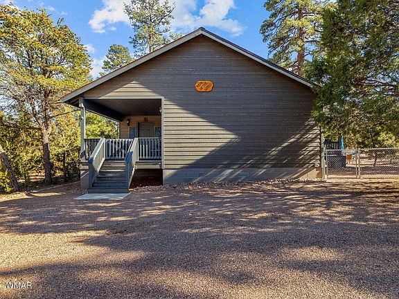 Nestled in the Heart of Heber Overgaard, this stunning corner lot property boasts a heavily treed landscape, featuring beautiful junipers and tall pines. Offering 1718 square feet of living space, the home includes 4 spacious bedrooms and 3 modern baths. Built in 2020 and remodeled in 2022, the home features low-maintenance siding and a Trex deck, perfect for outdoor entertaining. Enjoy the luxury of three covered decks, one of which provides a private entrance to the master suite. Cedar wood accent walls and vaulted ceilings add warmth and character to the open floor plan. Two separate master suites provide plenty of space and privacy for family or guests, each featuring its own stylish bath and generous closet space. The home is meticulously maintained, including a toy garage, etc.... w/electric, a storage shed, and RV parking with hookup. The property is fully landscaped and fenced with chain link, and with no HOA and a paved road, you'll have all the privacy and convenience you desire.