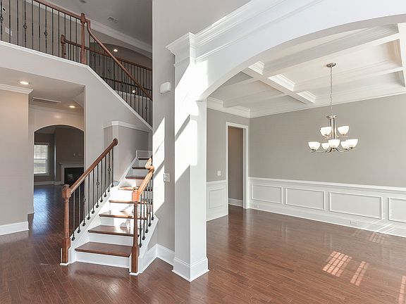 The Patterson II is a two-story plan with a stunning master on the main floor AND third-car garage! A very popular floor plan, the Patterson II has five bedrooms, three-and-one-half bathrooms and a large bonus room. Step in and admire the two-story foyer with arched entry ways into the dining and living room areas. A coffered dining room ceiling adds charm and elegance. Beautiful hardwood flooring flows throughout all main living areas on the first floor, master bedroom and upstairs hall. Elegant cabinetry and sleek granite create a fantastic color scheme in the gourmet kitchen. Gas range, stainless steel hood, and combination wall oven with built in microwave oven are perfect for the chef of the house! The huge family room is pre-wired for 5.1 surround sound and features soaring vaulted ceilings. The large downstairs master suite has a sitting room, his and hers closets, and an amazing master bathroom with separate tiled tub and shower. Secondary bedrooms can be found up the hardwood staircase, and all feature roomy walk-in closets. The bonus room upstairs is perfect for a media space or play room. Don't wait--this home will be gone soon! Call for more information today! Don't forget to enjoy outside living on the oversized rear wooden deck. Relax knowing that you've found your dream home!