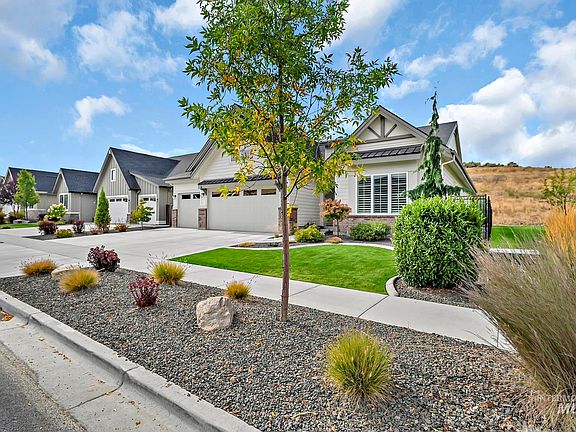Nestled in the scenic Boise foothills, Cartwright Ranch offers a perfect blend of natural beauty and modern living. Over 810 acres of open space and trails, and featuring two restaurants, a Veterinary Hospital, coffee shop, daycare, community library, pool, pickle ball, bocce ball and clubhouse. Now that you are in love with the location, fall in love with this immaculate single level home with custom wood shutters and designer touches throughout. An open layout is enhanced by the large windows and a soothing neutral color palette with quartz countertops, stainless appliances, a beautiful mix of cabinetry, and a covered outdoor living area. Relish a cozy flex room with glass barn doors and a connection from the master closet to the laundry room. Enjoy a picturesque setting against the hillside where deer sightings often occur, in addition to a common area with lush grass to provide ample privacy from neighboring homes. Nearly new and built by Brighton Homes, hurry because this special home will not last.