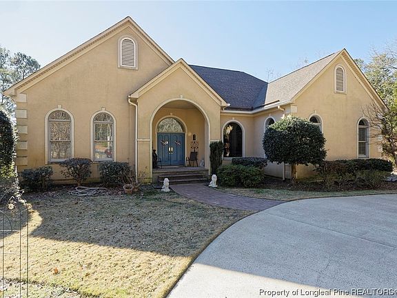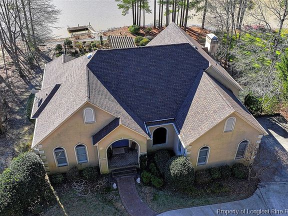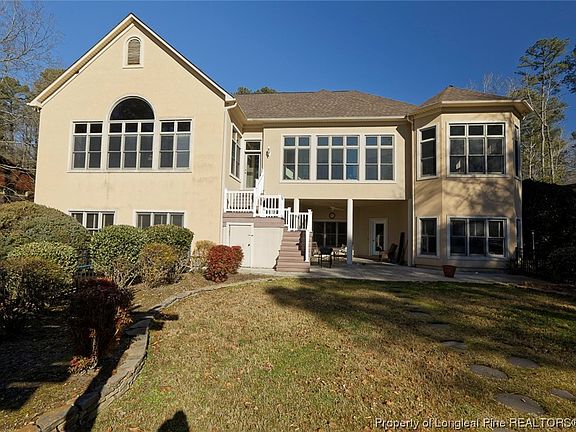 This elegant custom built home is an oasis! Nestled on the waterfront of Lake Trace with views of the 18th fairway of Creek Course in the gated and golf community of Carolina Trace. This spectacular home offers amazing views throughout the home. Large eat in kitchen with gratinate counters. Formal dining and Livingroom. Endless storage, it's own boat dock, putting green, fenced in yard, updated master suite, exercise room, Carolina sun room, workshop, library/office, regulation size billiards table, separate golf cart garage and much more!