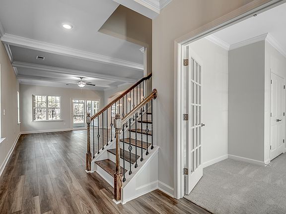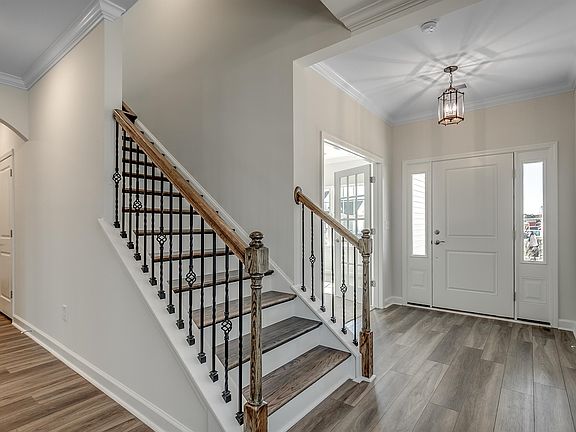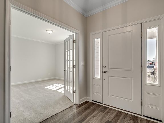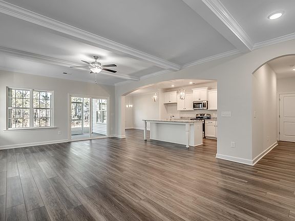 The Jensen is a beautiful three bedroom, two and one-half bathrooms and an office. This home is complete with the primary suite and office on the main level. The great room is enhanced with beamed ceilings, ceiling fan and is connected to the spacious kitchen through an arched opening. The large, gourmet eat-in kitchen has a gas range, counter height, table legged, island with plenty of room for seating, corner pantry, grey cabinets, white backsplash tile and under cabinet lighting. You will also find the laundry room, powder room , storage and coat closet on the main level. Follow the hardwood stair case to the second floor to find a loft and two generous guest bedrooms each with a walk-in closet, and a shared bath. Other features of this fine home include decorative molding upon entry, a large rear screened-in porch, grilling pad with gas line, outdoor stone fireplace, pet pad and a utility sink located in the garage.