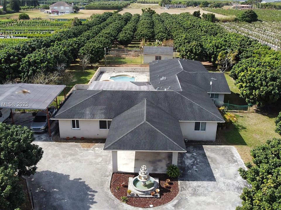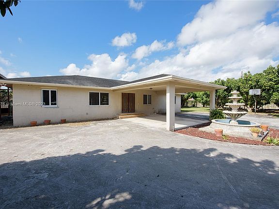 Large fenced ranch style home that sits on 3 acres and has plenty of space for parking. There is a porte-cochere with space for 1 car to park and an additional 4 cars can fit under the carport. This home has everything, a formal dining room, full size kitchen(eat-at counter and Oakwood cabinets), a formal living room, family room, media room(sound proof), an office, a gym(setup, equipment to be sold separately), and 2 laundry rooms(one with washer and dryer and the other with washer and dryer hook-up). There is an additional building for storage in the backyard with a lean-to attached. There are 2 wells one for irrigation for the grove and one for water supply to the house. There is a pool(salt system as-is) with a spa(heater as-is). Patio outside kitchen, bat cage, dog kennel, and grove.