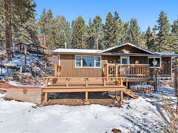 Peaceful mountain retreat with amazing views of Pikes Peak & surrounding mountains. Relax on the main deck or on the upper deck perched on the hill to take in the beautiful views of Pikes Peak & quiet surroundings. When you enter this charming mountain home you'll find everything on one level! Walk into the cozy living room that boasts bright windows, wood burning stove & beautiful built in book/entertainment center. Living room opens to the kitchen where you'll find granite tile counter tops, oak cabinets & dining area. Master bedroom includes built-ins in the closet & 2nd bedroom offers big views. Well designed updated bathroom adjacent to the utility/laundry closet w/plenty of storage. Property has 2 fenced in areas & storage shed. For peace of mind a new roof, sump pump & water heater were installed in 2014. This place is a little slice of heaven w/all the conveniences of living close to town, just minutes from shopping. Back on market because buyer's loan didn't get approved.