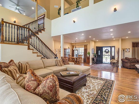 Experience this 6 bedroom, 5 bath home situated on nearly 2 acres of maturely landscaped grounds. Built with steel construction, this home is designed to last, offering durability and peace of mind for years to come.Inside, soaring ceilings and hardwood flooring create a warm and welcoming ambiance that is both inviting and impressive. The updated kitchen features slab granite, maple cabinetry and stainless steel appliances, perfect for creating memorable meals and entertaining guests.With a fully finished basement complete with a full kitchen, this home offers plenty of space for anyone to gather and relax in comfort and style. Step outside onto the new trex deck with gazebo and take in the stunning views of Rocky Mountains, the surrounding landscape or cozy up around the fire pit for a relaxing evening. Both furnaces and A/C units are brand new! The 60x40 accessory shop is an added bonus, featuring (2) 11.6 foot garage doors, 2 heaters, and a 2 bedroom apartment with Airbnb history- this is an excellent opportunity for those looking for multi-generational living or additional income. HOA fee includes irrigation water and trash. Don't miss this rare opportunity to own this exceptional property - schedule your private showing today!