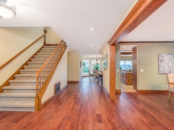 Luxurious custom-built estate, dream home located in a high-end community. Magnificent residence is graced with soaring ceilings and windows where one can gaze at sweeping views of Castro Valley from multiple vantage points. Designer touches throughout the home include hardwood floors, custom light fixtures, crown molding, custom paint colors and plantation shutters. The grand entryway with a staircase draws you into a voluminous layout made for entertaining. Welcome guests from the elegant front porch into the formal living room with a dramatic marble fireplace as the focal point and floor to ceiling rock detail. 50 year presidential roof. Meticulously maintained throughout. So many unique features. You won't want to miss this one of a kind home.