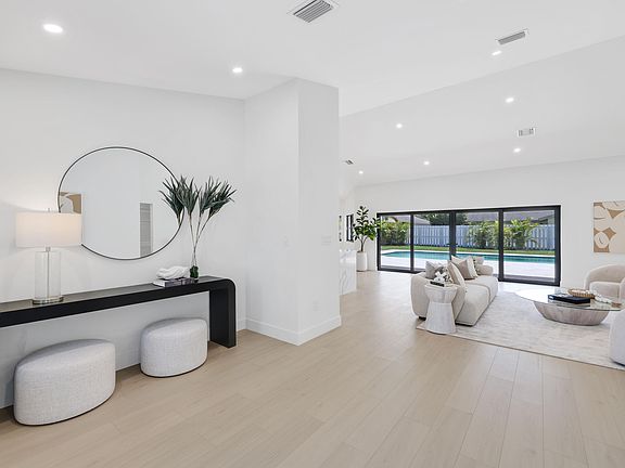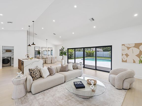 Be the first to live in this completely reimagined home in central Boca Raton. Taken down to the studs and rebuilt with top-tier finishes, this thoughtfully redesigned residence offers 4 bedrooms, 3 bathrooms, and a 2-car garage--including an expanded floor plan featuring a luxurious new primary suite, an added guest bathroom, and a full laundry room. Every detail was completed with quality craftsmanship and care--perfectly blending modern function with timeless style. The open layout offers vaulted ceilings, wide-plank flooring, LED lighting, and detailed custom millwork throughout. The kitchen is a showstopper, centered around an oversized island with quartz countertops and double waterfall edge, full-height backsplash, GE Profile appliances, and a walk-in pantry. Just off the dining room, a custom built-in bar with woodgrain wall panels and cabinetry adds style and function for entertaining. The primary suite features vaulted ceilings, a custom closet, and a spa-style bath with dual vanities, frameless glass shower, soaking tub, large-format tile, and recessed niches. All guest bathrooms have also been fully reimagined with custom vanities, quartz countertops, and lighted mirrors. Exterior highlights include all-new upgrades: dimensional shingle roof, garage door, travertine deck, resurfaced and tiled Diamond Brite pool, updated landscaping, irrigation system, fenced yard, and lighting. Additional improvements include new AC, ductwork, water heater, insulation, and electrical panel. Centrally located in Boca Raton, this home is minutes to A+ Rated Schools, award-winning beaches, Town Center Mall, all major highways, fine restaurants and more.