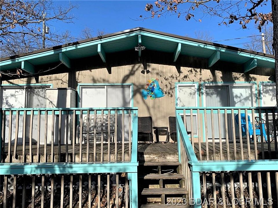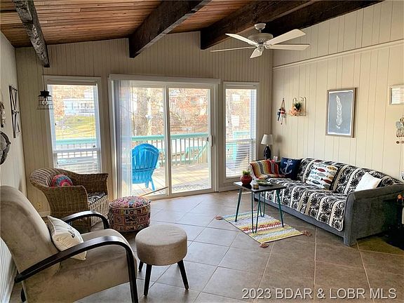 The perfect lake cabin for your weekend getaways or even full time living. This 3 bedroom, 1 bath open concept sits on a gentle lot in a quiet cove with deep water. Tile floors through out and beautiful wood ceilings. Dining area has built in seating that offers extra storage. All bedrooms have closets and 2 are lakeside that open to the large deck that runs the length of the home. There is an additional deck just down a couple of steps on the way to the dock. There is plenty of parking with the home situated to the side of the lot leaving room for a garage or even expansion- to the side or adding a 2nd floor. Included is a small shed for your outdoor equipment. Sellers do not know of any issues, but are selling the property in as is condition and are offering a one year homeowners warranty with Achosa. The paperwork has been completed to connect to Gravois Sewer in 2024 (new septic tank 2015). Bass Boat & Waverunner are available for sale. Come check out this cute, cute cabin.