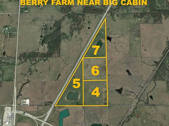 Parcel 4: Address - 1/2 Mile East of the Motel by the Big Cabin Truck Stop - 30993 S 4380 Road, Vinita, Corner of 310 & 4380. 40± Acres, Pasture, Fenced, Pond. Improved Home Site. Paved 310 Road Frontage, Gravel 4380 Road Access. Electric & Rural Water in Place. Possible Additional Home Sites. Pasture Is Not Leased. Home Site is Presently Rented @ $600 Per Month. IMPROVEMENTS: 1980 Modular Home, 1,288 SF, 3 Bedrooms, 2 Baths, Central H/A. Vinyl Siding, Metal Roof. 24'x22' Detached Garage. 70'x40' Barn. Loafing Shed. Parcel 5: 42.2± Acres, Pasture, Fenced. 6.4± Acre Pond + Small Pond. Paved 310 Road Frontage. Adjoins Parcel 4 on the West, Next to the Turnpike. Electric & Rural Water Accessible. Possible Home Sites. Not Leased. Parcel 6: 40± Acres, Pasture, Fenced. Gravel 4380 Road Frontage. Lies Directly North of Parcel 4. Electric & Rural Water Accessible. Possible Home Sites. Not Leased. Parcel 7: 35.1± Acres, Pasture, Fenced. 2.7± Acre Pond. Gravel 4380 Road Frontage. Directly North of Parcel 6. Electric & Rural Water Accessible. Cell Towers Have a Perpetual Easement, NO Income to Landowner. Possible Home Sites. Not Leased.