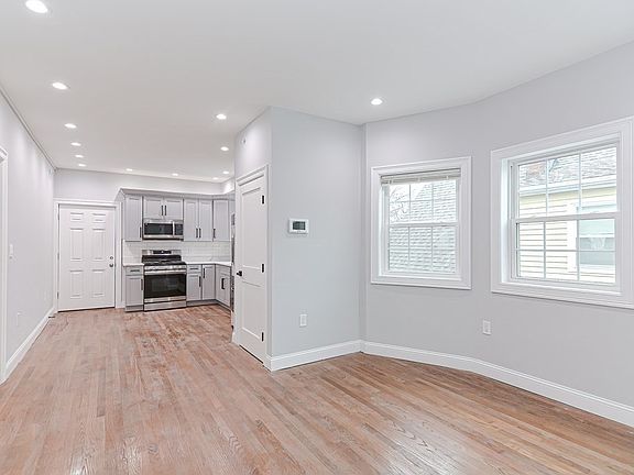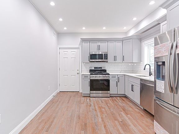 Newly Renovated, never lived in, 3 bedroom / 1.5 bath first floor apartment with private entrance for lease. The kitchen offers quartz countertops with matte grey shaker style cabinetry with all new stainless steel appliances (gas stove). Hardwood floors throughout, 2 ample sized bedrooms and one smaller bedroom, perfect for an office/nursery or 3rd bedroom. High energy efficient central air system, recessed lighting, wired for cable and video intercom. Private front and rear decks and off street parking for 1 car. The apartment is in excellent condition with great light and a great flow. Available for Immediate move in!