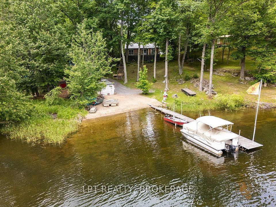 Welcome to your lakeside retreat on Bobs Lake! Impeccably updated 3 + 2-bedroom, 2 + 1-bathroom bungalow nestled on private sandy shoreline in Tichborne. From the moment you arrive, the landscaped grounds and striking metal roof set the tone for refined yet relaxed living.Step inside to discover a spacious interior finished with hardwood floors and oversized windows framing water views. The chefs kitchen is a showpiece, featuring granite countertops, stainless steel appliances and a convenient breakfast island. Adjacent, the sunlit dining area opens through sliding glass to a generous deck with clear-pane railing ideal for entertaining.Retreat to the primary suite, complete with ensuite bath and lake vistas. Two additional main-level bedrooms share a modern full bath, while a lower-level wing offers two more bedrooms, a full bath and versatile family room perfect for guests or home office.Outside, the fun continues at the waters edge: new stairs lead to your private sand beach, where a custom dock and powered gazebo (complete with satellite TV and hydro) await summer gatherings. A private road down to the lake ensures easy access. Back at the home, a heated two-car garage, generator plug at the hydro meter. With every detail thoughtfully curated from the granite counters to the gazebo amenities this bungalow embodies vacation at home. Embrace lakeside living in style. Schedule your private tour today.