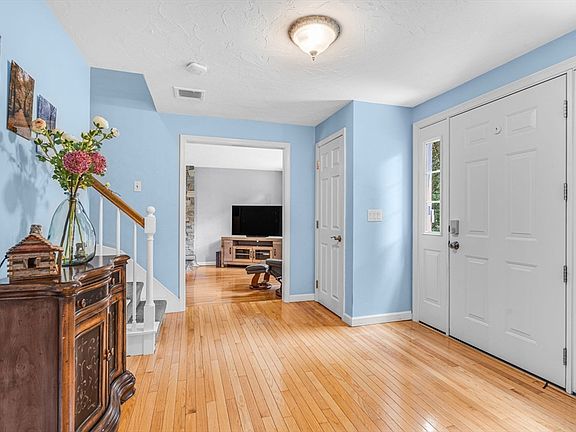 Beautifully situated brick front colonial in popular sub division close to schools and center of town. Great hardwood floors throughout first and second floor. Two gorgeous updated baths. Step down living room has stunning 9ft field stone fire place wall with raised hearth and french doors to rear deck and yard. Kitchen has tons of workspace, all new appliances and large eating area. Private screened porch with views to the rear yard and gardens extends your out door enjoyment! First floor office has built in workspace. The inviting family room has cathedral ceiling, sky light and stairs to private loft. Primary suite is spacious with fireplace, updated tiled bath, walk in closet, hardwood floors. Three more bedrooms all with hardwood flooring. The lower level has small flex space. Seller has replaced all windows, new front door & entry foundation, replaced gutters, and installed new garage door openers. New patio, new hot tub, and new boiler. All new appliances. Its ready for you!