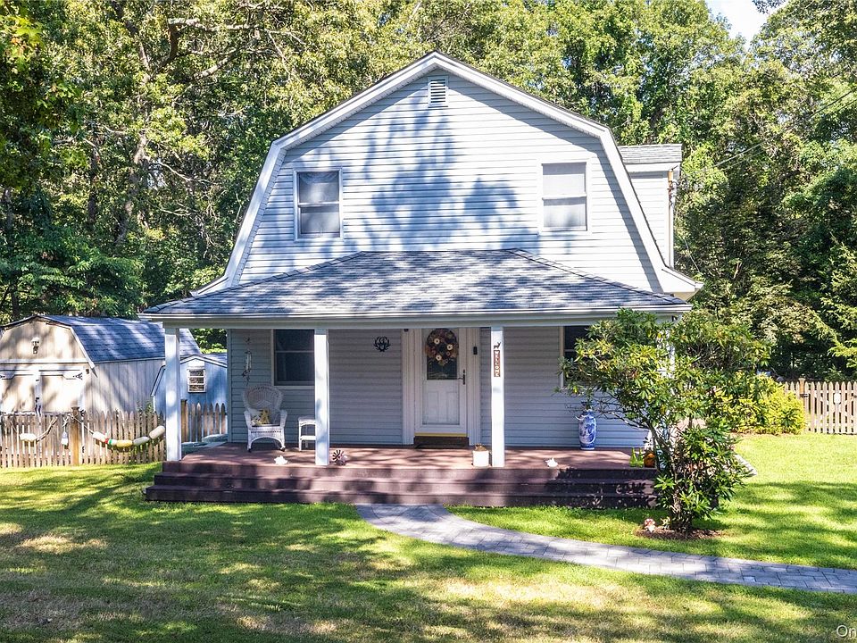 ****OWNER RELOCATING **** COME SEE THIS CUSTOM BUILT CHARMING CAPE**** Home is on the boarder of Middle Island and Medford, This home features a covered front porch and sits on half of an acre of land with park like settings. Rear of property is connected to County land never to be built on. Enjoy your evenings sitting by the fire pit, (yes it is included),or having a BBQ on your patio. Eat in kitchen, all newer stainless steel appliances with "Life Proof" laminate flooring, bay window and French doors overlooking the country setting. Large living room has recessed lighting along with pellet stove that will decrease your heating bills for sure, along with wall to wall "Life Proof" carpeting.. Full bathroom on first floor. 3 bedroom on 2nd floor with wall to wall carpeting. 2 zone heat and Central air conditioning. Full basement, partially finished, utilities and workshop. 2 sheds are a gift. Rear yard is fenced, along with deer fence. Driveway is large enough for parking of at least 6 cars. Front gutters are rain guard. Convenient to all major highways, shopping and a short ride to the east end vineyards and ocean beaches. Home is in Excellent condition.