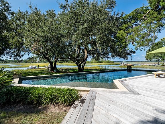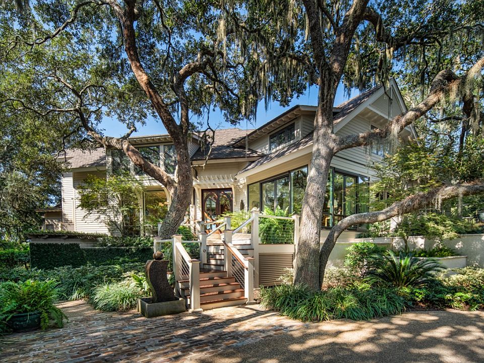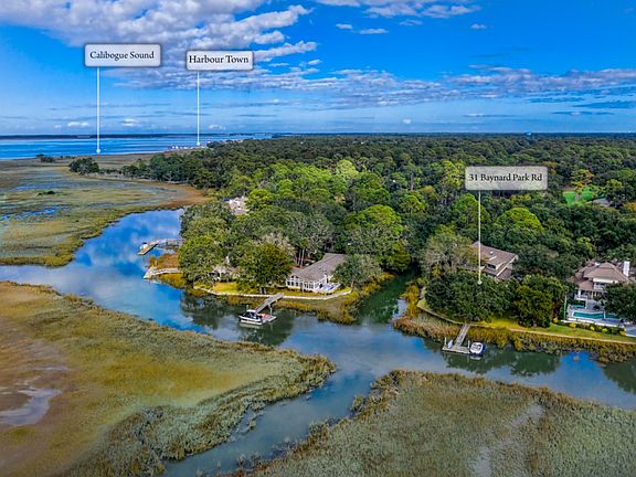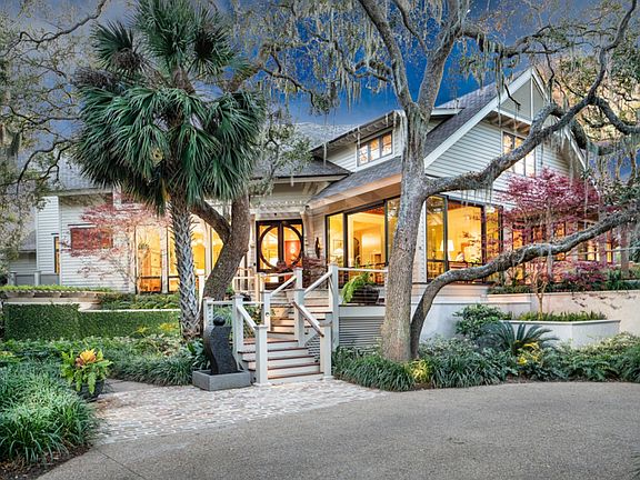 Private waterfront peninsula property is sited among the trees and faces the inlet leading to Calibogue Sound. Artfully designed to incorporate the water wrapping two sides of the property, a long drive guides through 1+ acres estate, revealing the spectacular home, pool, dock, guest quarters and three car garage. Water features, outdoor spaces and disappearing glass doors enhance the vantage points from every room. Specimen hardwood floors run throughout all levels of the home, custom moldings rise from the baseboards and extend to the ceilings, and smart storage solutions are found in every room.