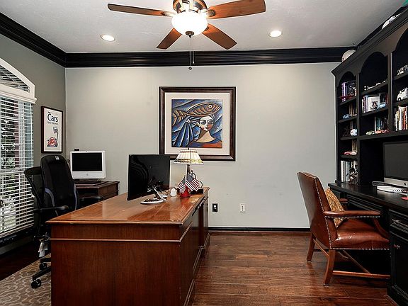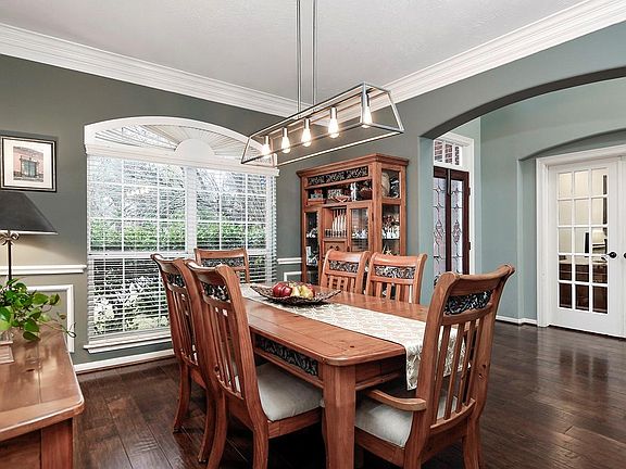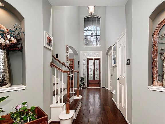 Lovely 5 bedroom home on a cul-de-sac street in Alden Bridge! Zoned to excellent schools, and close to area parks and playgrounds, tennis courts, shops and restaurants, as well as miles of walking/bike trails. A 4 year old roof, 2 car garage with epoxy flooring and new built-in cabinetry, hand scraped hardwood floors and a nice, open concept are just a few highlights of this home. The study with French doors is the ideal work from home space, and the formal dining with stunning mill work can accommodate many guests. Huge laundry room with abundant cabinet storage. The spacious kitchen with granite island, breakfast bar, distressed cabinets, gas cooktop and double ovens opens to the sunny breakfast nook and family room with gas fireplace. Primary bedroom suite downstairs offers a walk-in closet with new built-ins; 4 bedrooms and a game room upstairs with large double paned windows; fantastic backyard has a heated pool and spa with guard fence for kids and low maintenance decking.