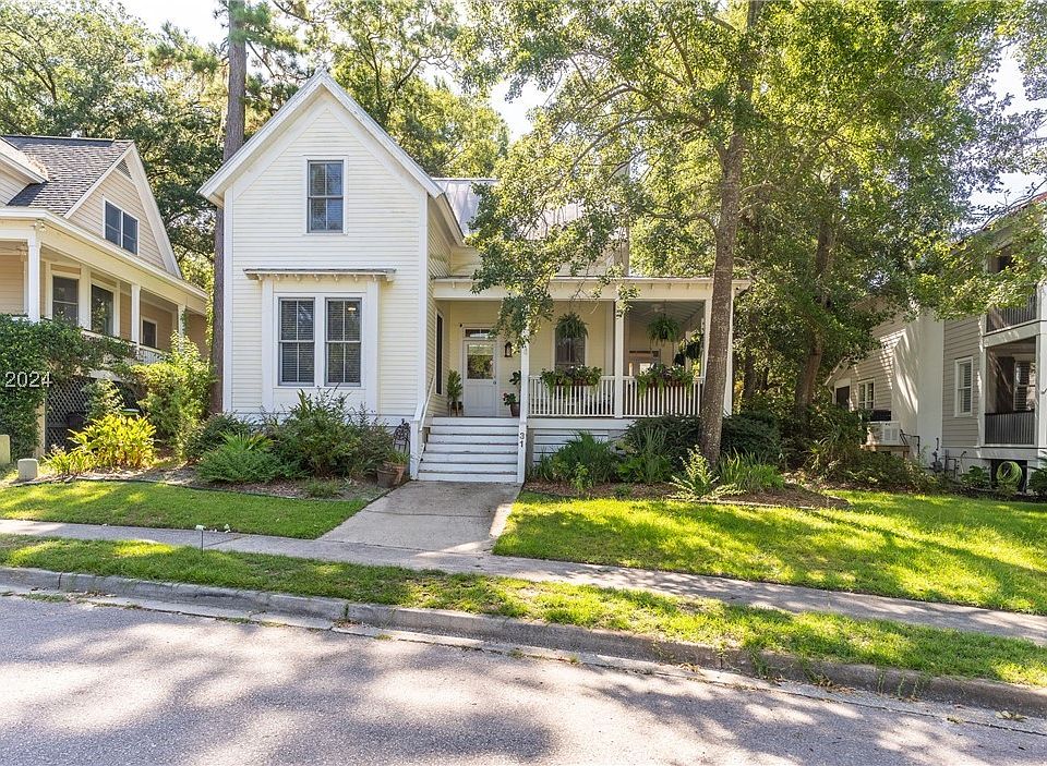 Charming Home in the Highly Desirable Battery Point Community! This classic Southern Living Simmons Creek Cottage is on one of the highest points in the neighborhood, so NO flood insurance is required. Enjoy sunsets & pond views from the wrap-around front porch. Inside, find 10-ft ceilings & an abundance of natural light. Enjoy a spacious first floor master and a office/flex space. A quaint breakfast nook with french doors to the porch & a natural gas hookup for convenient year-round grilling. Cozy up by the gas fireplace with natural light. Upstairs, find 2 bedrooms, a full bath, and a loft-style family room. Enjoy fully fenced in backyard.